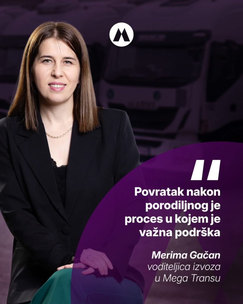 Za Merimu Gačan, voditeljicu izvoza u Mega Transu, ovo je bilo drugo porodiljno odsustvo u kompaniji u kojoj radi već devet godina. Iskustvo ju je, kako kaže, još jednom podsjetilo koliko je važno imati razumijevanje i podršku okruženja.
