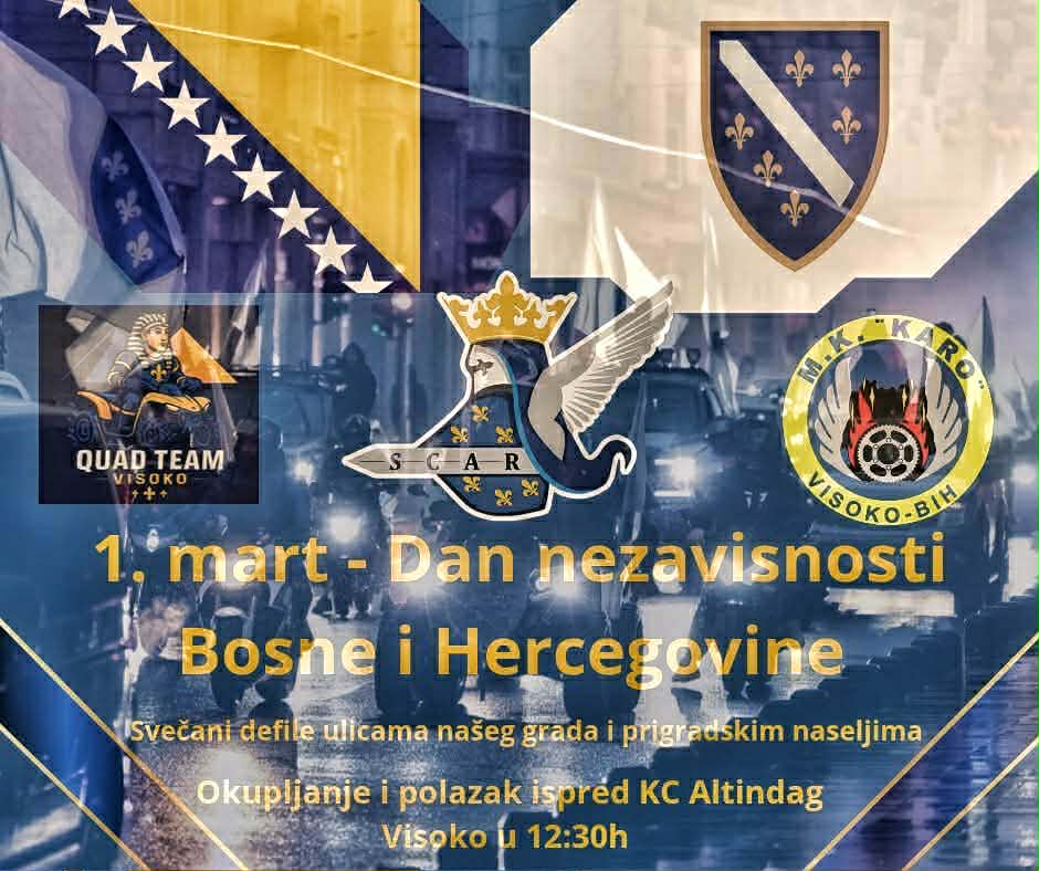 Nakon zajedničkog učešća u realizaciji protokolom predviđenih aktivnosti za Dan nezavisnosti od strane Gradske uprave grada Visoko, uputit ćemo se na plato i putnu komunikaciju ispred KC Altindag gdje ćemo formirati kolonu iza vozila MUP-a koju će sačinjavati motori, quadovi i automobili okićeni i ukrašeni zastavama i simbolima naše domovine.
