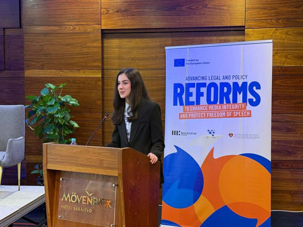 “Učešće na ovom događaju za mene je bilo izuzetno značajno, jer sam imala priliku obratiti se prisutnima kao predstavnica mladih o temama koje nas se direktno tiču. Posebno mi je važno što se otvorio prostor za razgovor o ulozi medija i slobodi izražavanja iz perspektive mladih. Na panel diskusiji imali smo priliku vidjeti širu sliku i konkretnu analizu trenutnog stanja, odnosno položaja medija i novinara u Bosni i Hercegovini, što je dodatno naglasilo koliko su ove teme važne i koliko prostora za unapređenje još uvijek postoji.” (Lejla Fišek)